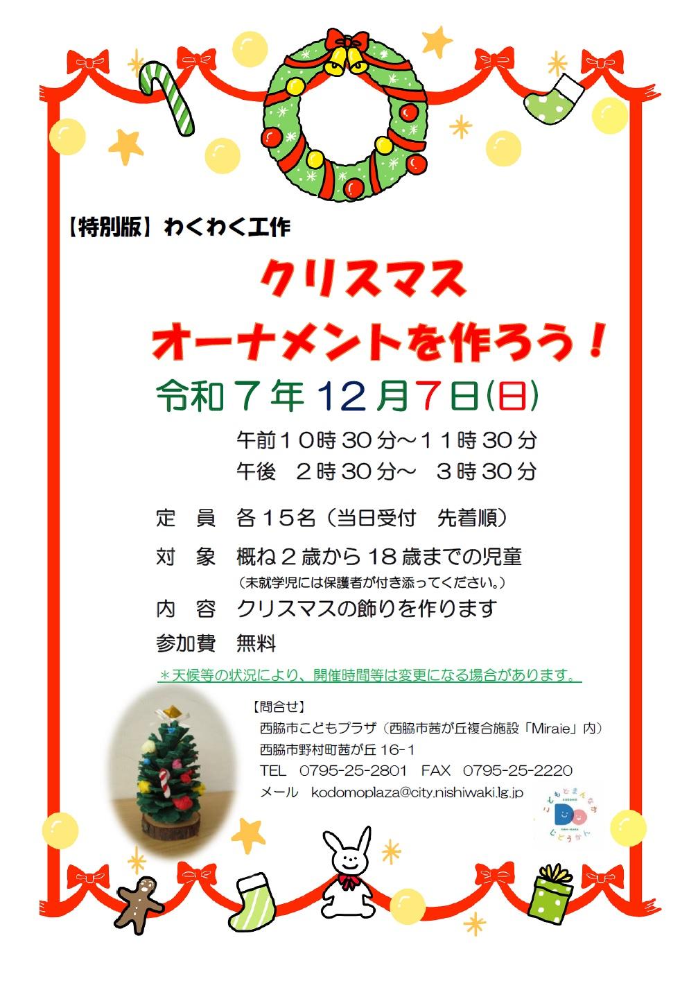 クリスマスになると、ツリーやリースを飾る方もいらっしゃると思います。見ているだけで、ワクワクしますよね!今週のわくわく工作は、特別版!クリスマスのオーナメントを作ってみませんか?詳しくはチラシをご覧ください。